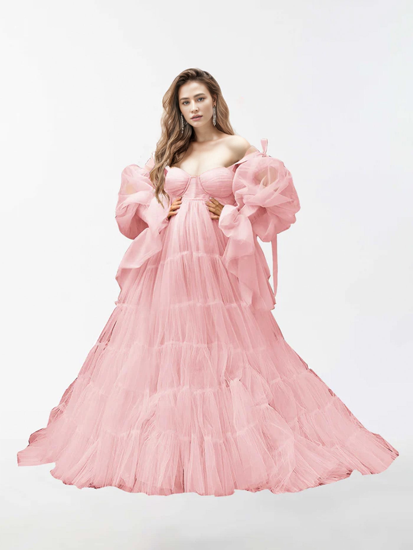 Capture the beauty of motherhood with our gown. Designed with fluffy long sleeves and tulle, this stunning maternity photography gown is perfect for showing off your bump. With a front slit for added elegance, it's a must-have piece for your maternity photo shoot.
