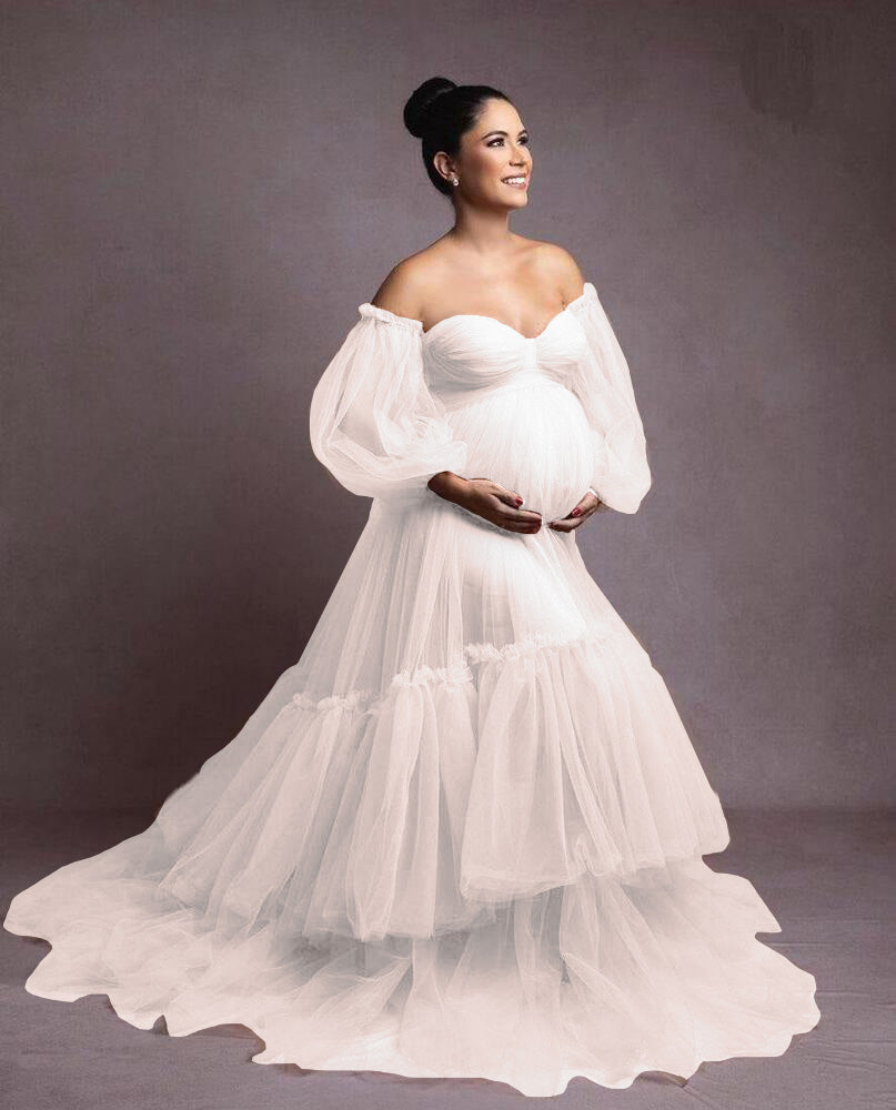 Mesh Lantern Sleeve Ruffle Small Tail A-Line Maternity Photography Dress RB16